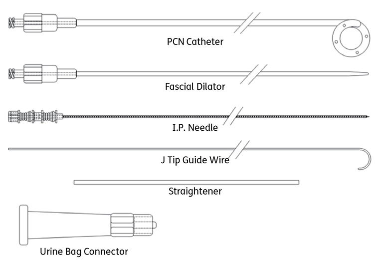 The ASTER PCN Catheter Set is used for the percutaneous placement of a pigtail catheter in the renal pelvis for nephrostomy drainage.